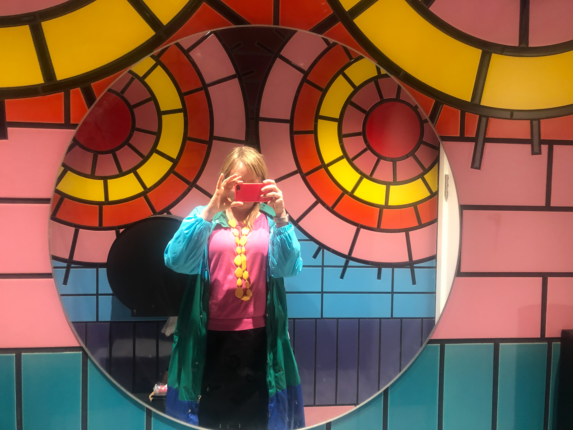 This is the one I saw on Instagram (looking into the end cubicle). It’s interesting to think about which one is ‘most Instagrammable’. But this other one (indicating the adjacent cubicle) the sort of fleshy red one, do you want to tell us about the colours of this?